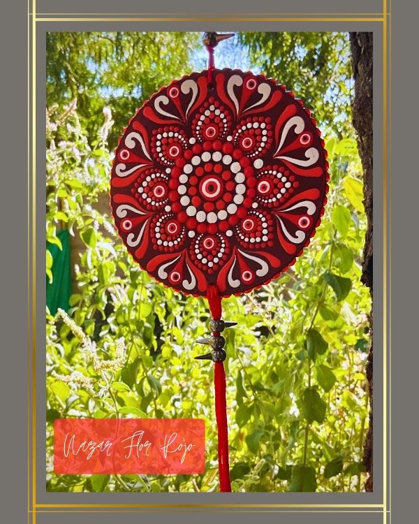 Madera de fibrofacil de 10 cm de diámetro, pintados con acrílicos en técnica de puntillismo. Detalles de gemas brillantes en su contorno. Hilo de seda para colgar con cuentas metálicas.